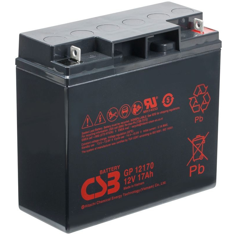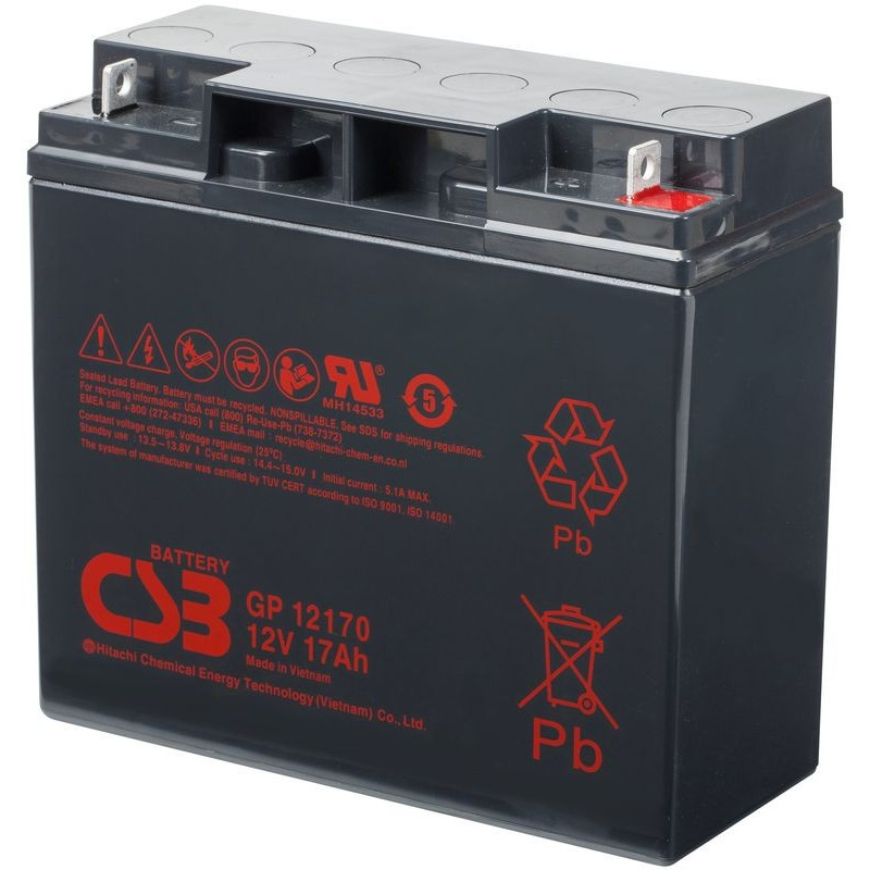GP 12170 - батарея общего применения со сроком службы 5 лет в буферном режиме или более 260 циклов заряда-разряда в циклическом режиме при 100% разряде. Как и все батареи CSB, она перезаряжаемая, высокоэффективная и не требующая обслуживания.