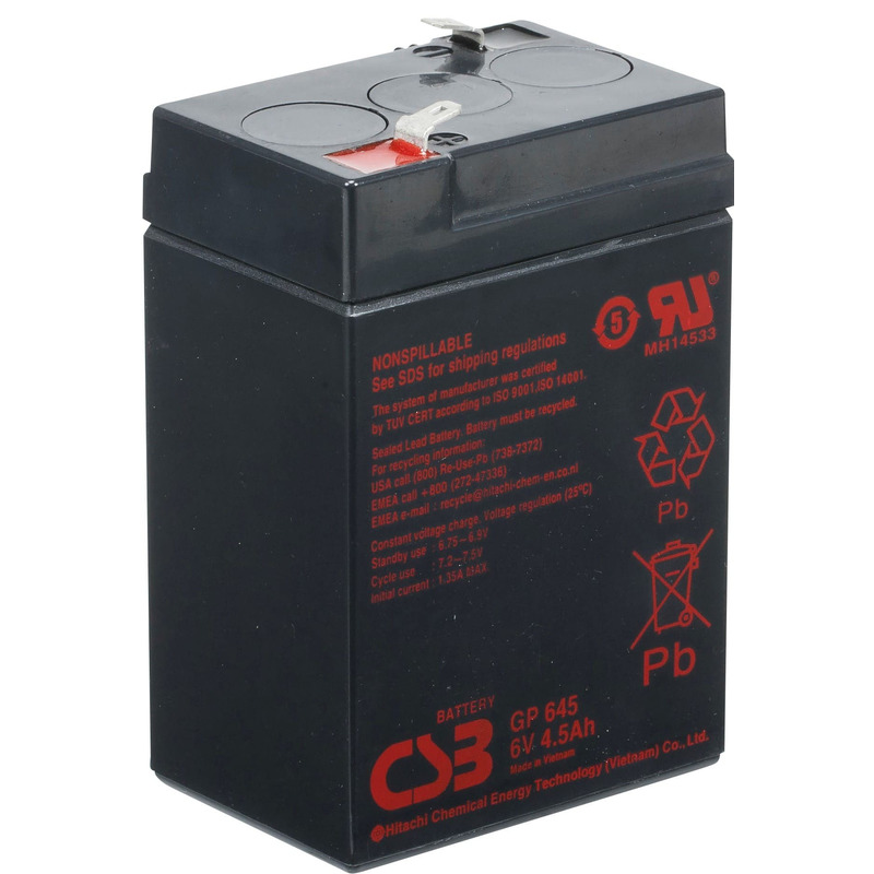 GP 645 - батарея общего применения со сроком службы 5 лет в буферном режиме или более 260 циклов заряда-разряда в циклическом режиме при 100% разряде. Как и все батареи CSB, она перезаряжаемая, высокоэффективная и не требующая обслуживания.