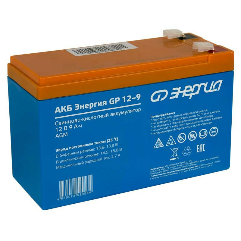 Аккумулятор Энергия АКБ GP 12-9 изготовлен по технологии AGM и предназначен для эксплуатации в буферном режиме в устройствах бесперебойного электропитания, охранной и пожарной сигнализации, информационных и телекоммуникационных системах и других типов оборудования, при работе которых не допускается перерывов в электропитании.