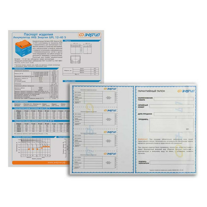 Характеристики Аккумулятор Энергия GPL 12-40 S