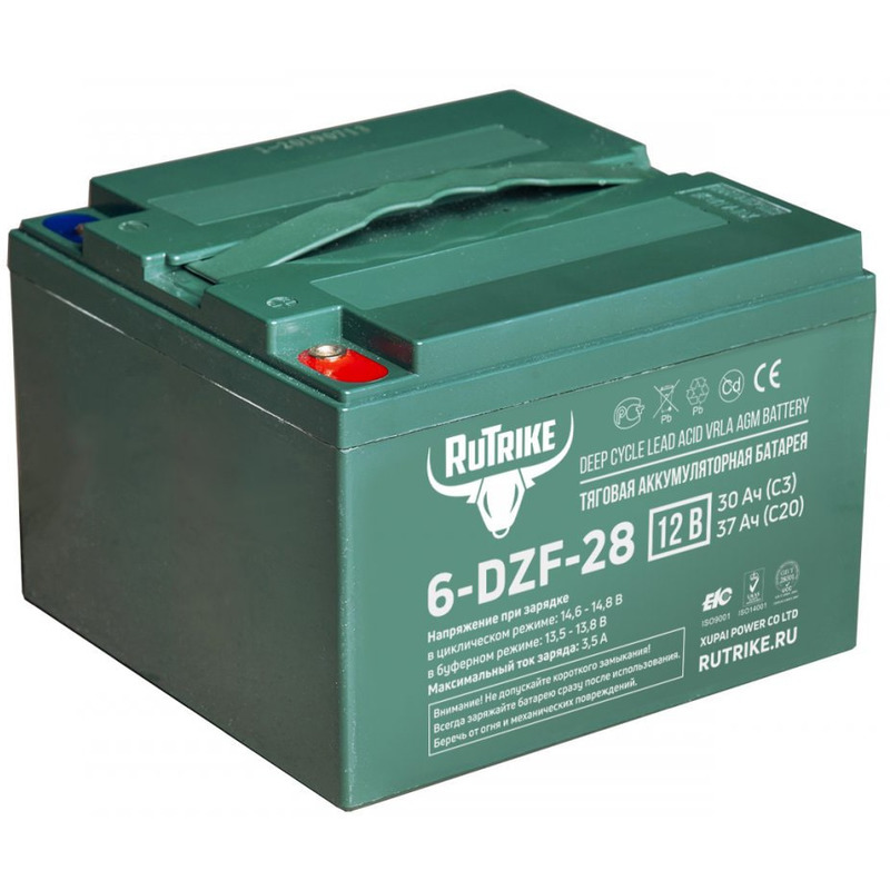 Необслуживаемая аккумуляторная батарея RuTrike 6-DZF-28 с системой рекомбинации газов (VRLA) произведена по технологии AGM. Батарея выполнена по технологии внутреннего формования. В толстых свинцовых пластинах используется экологичный сплав без кадмия и мышьяка.