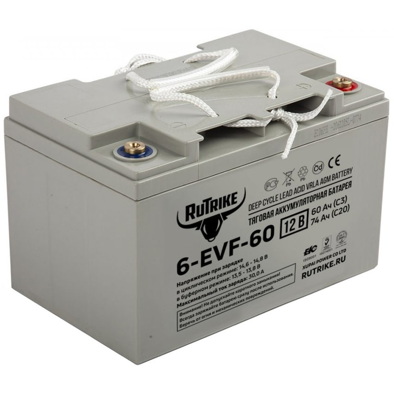 Rutrike 6-EVF-60 - необслуживаемая аккумуляторная батарея с системой рекомбинации газов (VRLA), произведенная по технологии AGM. Батареи выполнены по технологии внутреннего формования. В свинцовых пластинах, имеющих большую толщину по сравнению со стандартными аккумуляторами, используется экологичный запатентованный сплав без кадмия и мышьяка. Плотный сепаратор из углеволокна пропитан электролитом, изготовленным по технологии NANO GEL. Электролит находится в сгущенном состоянии, не даёт утечек и не требует долива воды на протяжении всего срока эксплуатации.