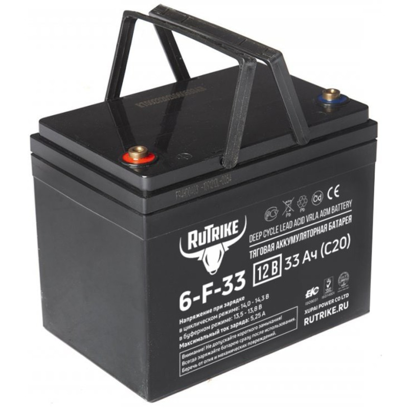 Аккумуляторная батарея Rutrike 6-F-33 выполнена по технологии AGM и состоит из утолщённых свинцовых пластин и плотного слоя сепаратора между ними. Батарея не требуют обслуживания на протяжении всего цикла эксплуатации. Отлично подходит для работы в системах безопасности и сигнализации, системах бесперебойного питания, системах аварийного освещения, в лёгком и детском электротранспорте и в других схожих сферах применения.