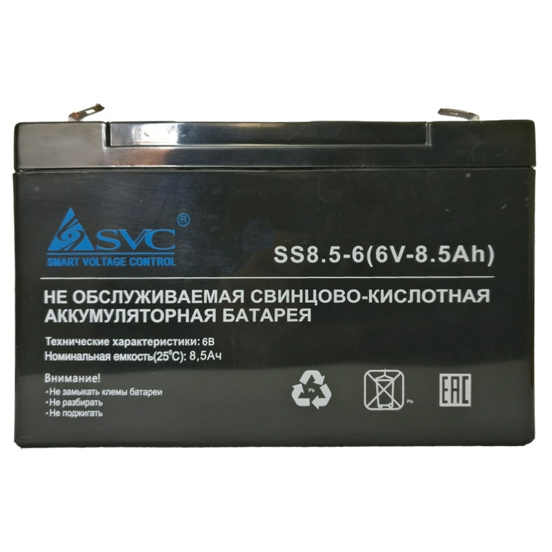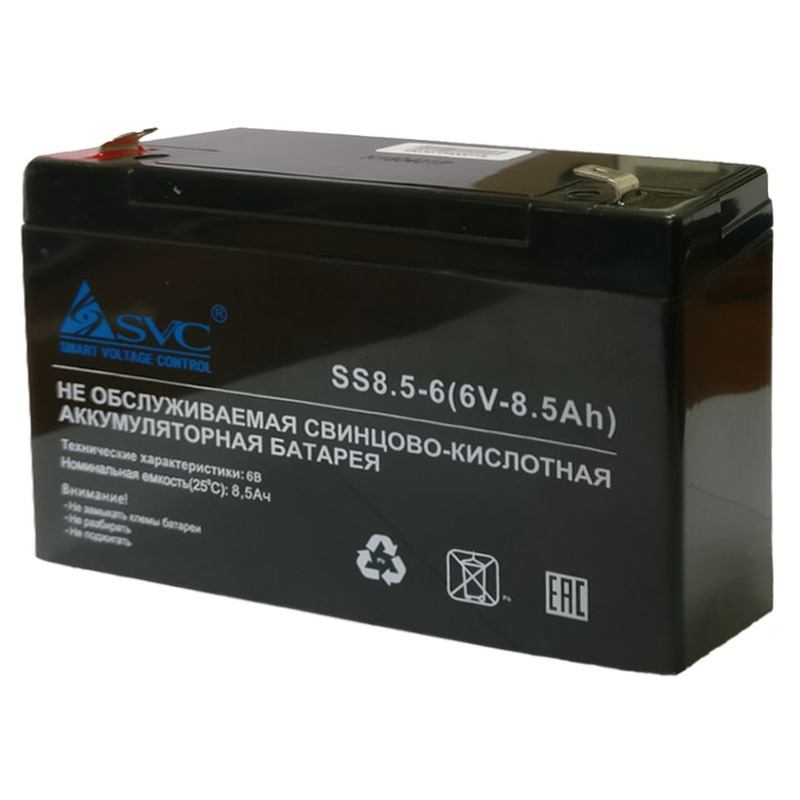 Аккумулятор SVC SS8.5-6 - необслуживаемая батарея, не требует доливки воды, предназначена для работы в циклическом режиме (выдерживает до 600 циклов). Низкий уровень саморазрядки обеспечивает срок службы от 2 до 4 лет в резервном (буферном) режиме. Герметичная конструкция позволяет использовать батарею в любом положении. Основная сфера применения данной продукции - источники бесперебойного питания (UPS) любой мощности и конфигурации. Также данные батареи широко используются в пожарном, охранном и прочем оборудовании, требующем резервного питания. На сегодняшний день вне конкуренции по соотношению цена/качество.