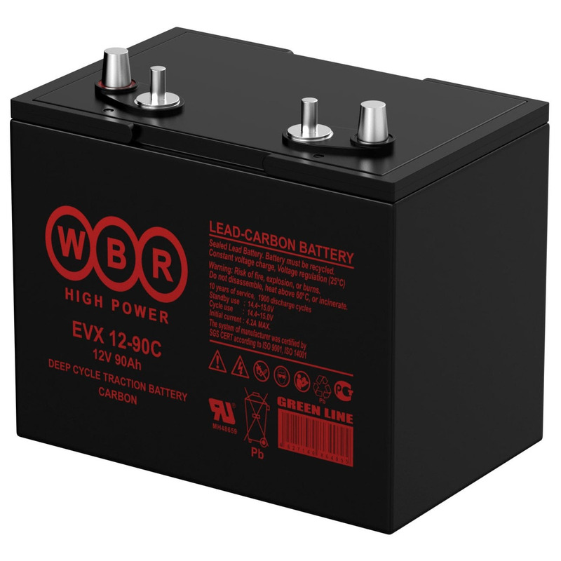 Аккумуляторы WBR EVX C - герметизированные, выполненные по технологии AGM, карбоновые свинцово-кислотные батареи. Обладают высоким качеством и надежностью, устойчивы к глубоким разрядам и применяются для питания электрических транспортных средств, гольфкаров, газонокосилок, полотерных и поломоечных машин, медицинских колясок, электроинструмента, электронасосов, эхолотов, осветительных приборов, в том числе и наружного освещения, и другого вспомогательного оборудования.