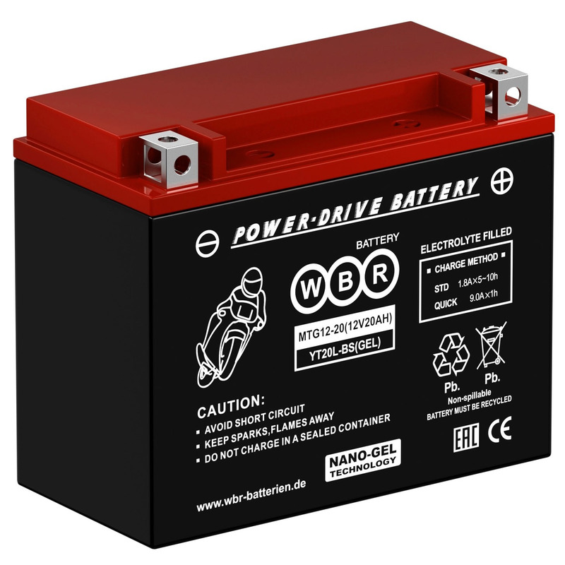 Герметизированные, выполненные по гелевой технологии (GEL), стартерные мотоциклетные свинцово-кислотные аккумуляторы WBR MTG12-20 обладают высоким качеством и надежностью. Эти аккумуляторные батареи успешно выдерживают конкуренцию со стартерными батареями этого класса других производителей, соответствуют техническим характеристикам и являются аналогом мотоциклетных аккумуляторных батарей YUASA серии YB14L-BS. Они предназначены для работы приборов и пусковых механизмов на мотоциклах, скутерах, гидроциклах, квадроциклах, снегоходах и мотовездеходах.