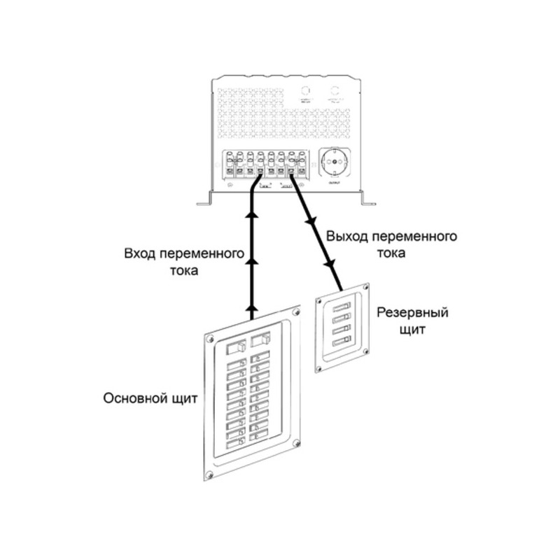 - Евро розетка и клеммная колодка: Евро розетка на задней панели ИБП дают возможность самостоятельно и быстро подключить нагрузку. Клеммная колодка позволяет надёжно подключить фазозависимый котёл отопления, циркуляционные насосы или резервный щит