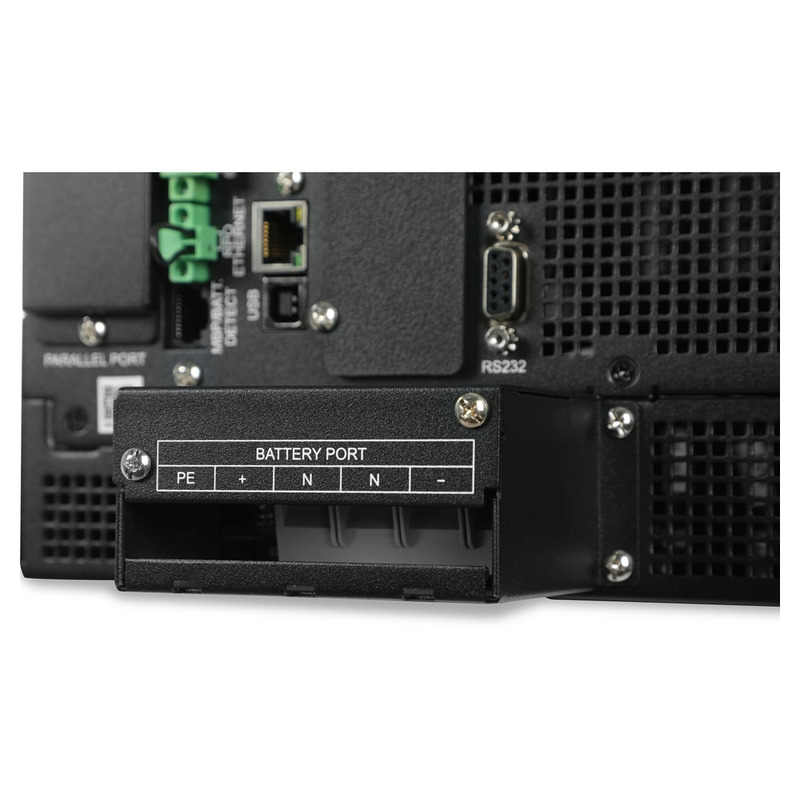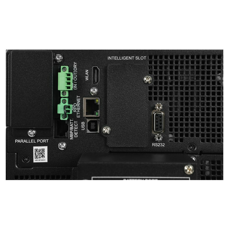 Дополнительно ИБП оснащен интерфейсными портами и поддерживает EPO (Emergency power off), "сухие контакты", RS-232 (COM), USB.