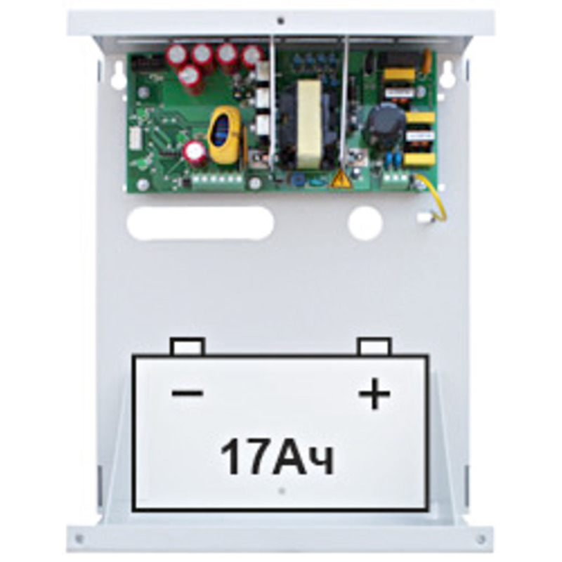 Корпус под АКБ 17 Ач, диапазон входного напряжения 170-242 В. Соответствует ФЗ 123 и ГОСТ Р 53325-2012: 3 индикатора и 3 информационных выхода — Сеть, АКБ, Выход, защита выхода от перегрузки и КЗ, защита АКБ от глубокого разряда, КЗ и переполюсовки, контроль наличия АКБ, холодный пуск.