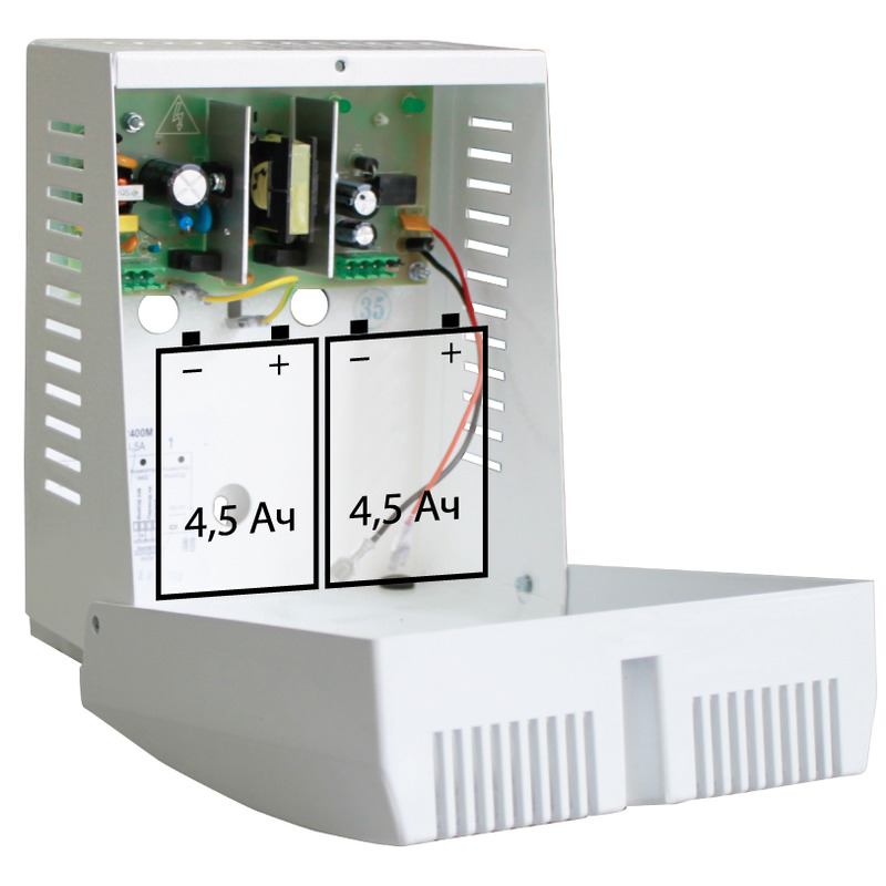 24 В, 1,5 А. Корпус под 2 АКБ 12 В 4,5 Ач. Соответствует ФЗ 123 и ГОСТ 53325-2012: 3 индикатора и информационный выход «Переход на резерв», защита выхода от перегрузки и КЗ, защита нагрузки от аварии источника, защита АКБ от глубокого разряда, КЗ и переполюсовки, «холодный пуск».