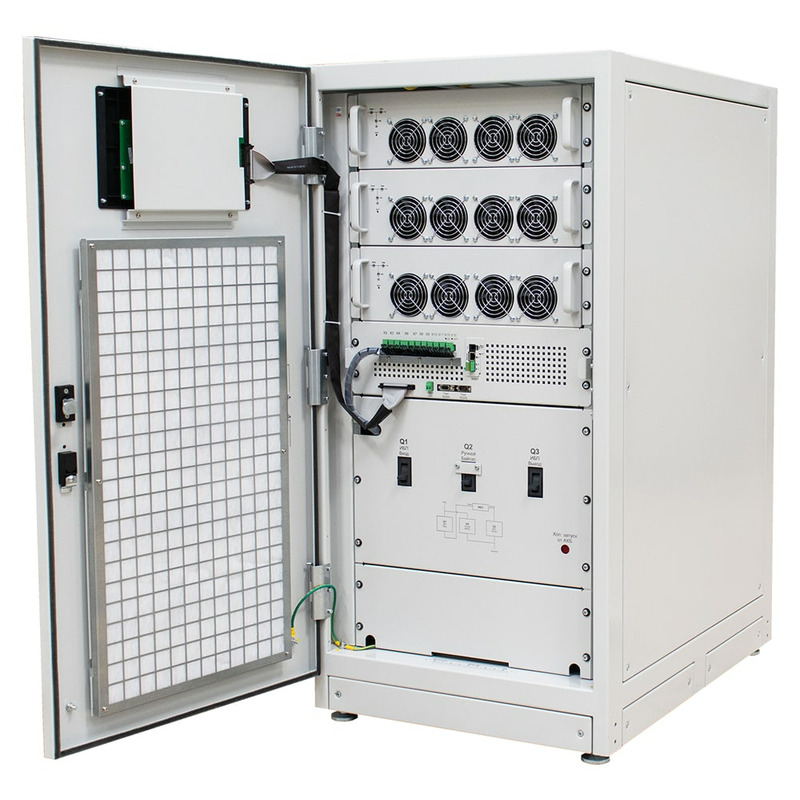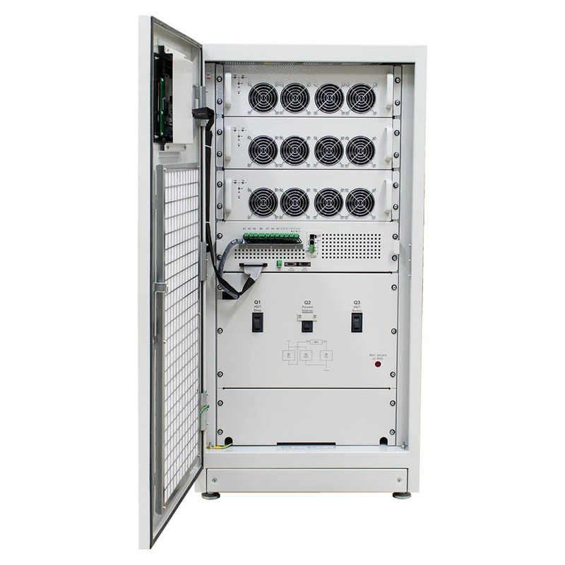 Модульный онлайн ИБП SM060/20 (3x20) предназначен для обеспечения бесперебойной работы и надежной защиты от перепадов сетевого напряжения трехфазной критической нагрузки. SM060/20 (3x20) представляет собой прочный металлический шкаф, в котором установлено три силовых модуля по 20 кВА / 18 кВт и другая компонентная база устройства. Дверца шкафа имеет противопылевой фильтр.