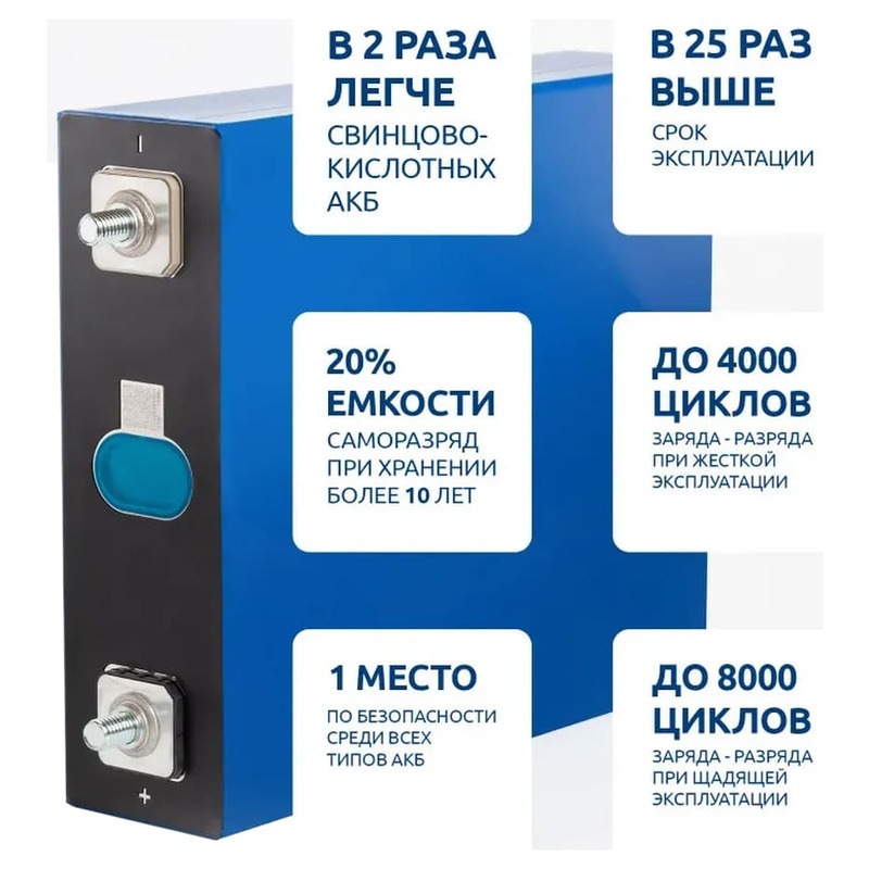 - Высокая плотность энергии по сравнению со свинцово-кислотными АКБ
