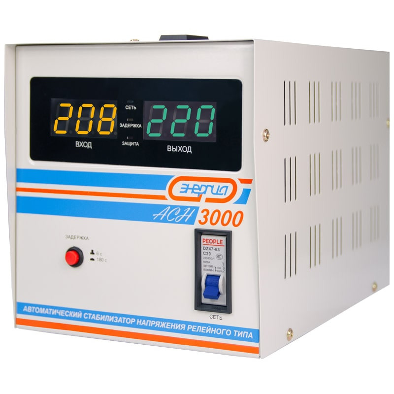 АСН-3000 - напольный стабилизатор релейного типа, применяется в однофазных сетях как в частных домах, так и на дачных участках. Адаптирован под Российские электросети. Можно эксплуатировать при минусовых температурах. Обладает высокой скоростью реакции на изменение напряжения (4 м/сек) и широким рабочим диапазоном напряжений на входе 140-260 В.
