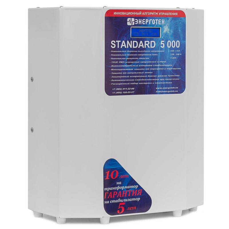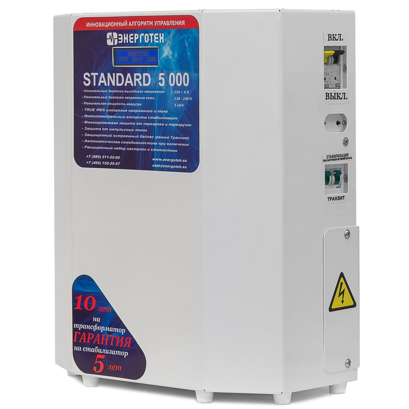 Серия STANDARD разрабатывалась как базовая модель стабилизаторов напряжения Энерготех. Она подходит для большинства объектов, где есть проблемы с напряжением, и служит защитой от скачков в сети.